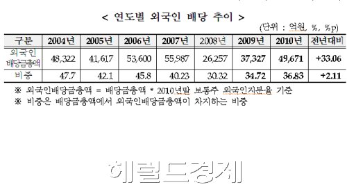 18일 한국거래소가 유가증권시장 12월 결산법인 650개사 중 지난해 현금배당을 한 479개사의 배당 현황을 분석한 결과, 외국인 실시간 해와 토토사이트 총액은 전년의 3조7300억원보다 33.06% 많은 4조9700억원으로 집계됐다. 전체 실시간 해와 토토사이트 총액에서 외국인이 차지하는 비중은 전년보다 2.11%포인트 높은 36.83%를 기록했다.