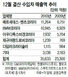 19일 머스트잇 토토 업계 및 금융감독원 등에 따르면 메르세데스-벤츠코리아, BMW코리아, 아우디폭스바겐코리아 등 12월 결산법인 10개 머스트잇 토토 업체의 작년 전체 매출액은 3조5633억원에 달했다. 2009년 2조3300억원에 비해 53% 급증했다.
