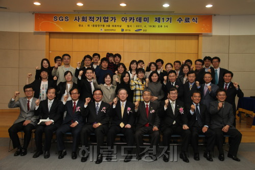 삼성과 경기도, 성균관대학교가 함께 한 SGS골드문 토토사이트 추천 양성 아카데미 과정 수료식이 19일 성균관대 수원캠퍼스 제1공학관에서 열렸다. 33명이 수료한 이날 행사에서 김준영(앞줄 오른쪽 네번째) 성균관대 총장과 이창렬(앞줄 오른쪽 다섯번째) 삼성사회봉사단 사장 등이 수료생들과 파이팅을 하고 있다.