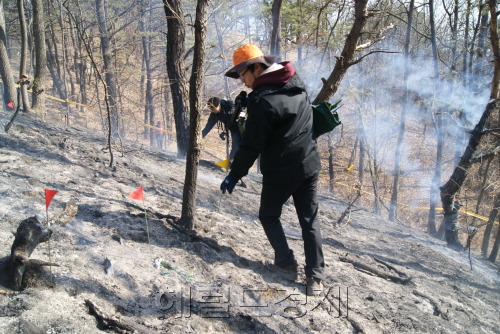 “타다만 솔방울, 풀이 탄 모양, 버려진 병ㆍ깡통이 그을린 모양 등 모든게 증거다. 나무 껍질 같은 것은 불이 온 방향쪽이 더 많이 탄다. 그런걸 보고 불길을 역추적해간다”