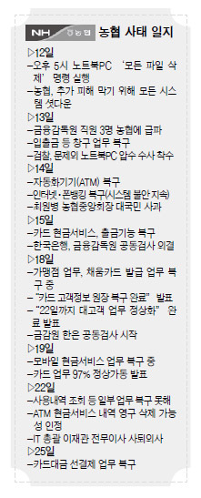 ▶일부 거래내역 왜 복구 못하나=사상 최악의 전산사고는 지난 12일 오후 5시께 농협 IT분사 협력업체인 IBM 직원의 노트북PC에서 모든 파일을 삭제하는 ‘rm’(remove의 약자) 명령어가 실행되면서 시작됐다. 더욱 심각한 것은 삭제된 파일을 복구조차 할 수 없도록 하는 ‘dd’(data description의 약자) 명령어가 포함돼 있었다는 점이다.