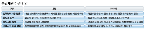 국제금융기구의 도움을 받는 방법과 함께 북한ㆍ중국의 동북3성ㆍ몽골을 포함한 동북아개발은행(NEADB)의 설립 같은 동북아 국제금융 시스템을 만들거나 북한 재건만을 특수하게 적시한 북한개발신탁기금의 형성 등이 해법으로 제시되고 있다. 국민 부담도 줄이고, 명분도 뚜렷하지만 국제사회와의 긴밀한 협력과 설득이 뒷받침돼야 실현 가능한 방안이다.