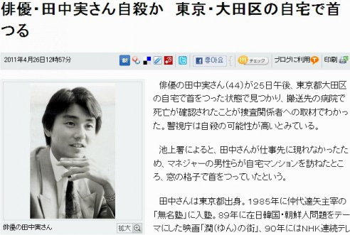 27일 아사히 신문은 인기 배우 갤럭시 토토사이트 미노루가 25일 오후 도쿄 시내 자택에서 목을 맨 채 숨져있는 것을 매니저가 발견해 경찰에 신고했다고 전했다. 발견 당시 그는 창문 쇠창살에 머플러로 목을 매 의식이 없는 상태였던 것으로 알려졌다. 경시청은 그가 스스로 목숨을 끊은 것으로 보인다고 발표했다.