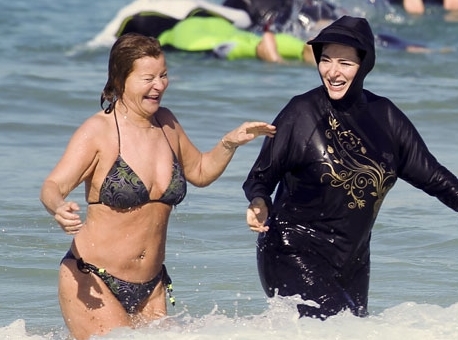 당시 그녀는 노출이 심한 수영복을 입는 대신 소위 무슬림 여성을 위해 디자인 된 수영복인 부르키니(burkiniㆍ사진 오른쪽)를 입었다. 부르키니는 온 몸을 거의 뒤덮어 노출이 거의 없는 옷이다. 이에 비해 당시 그녀와 동행한 친구인 코미디언 Maria McErlane(사진 왼쪽)는 노출이 심한 비키니를 입어 대조적인 모습을 보였다.