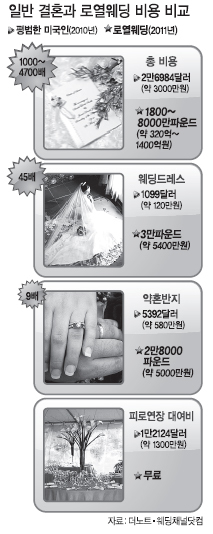 29일 영국 윌리엄 왕자와 케이트 미들턴의 결혼식을 앞두고 전 세계인들의 관심이 고조되고 있다. 최근 미 MSN머니는 보통 사람들의 결혼과 로열 수많은 스포츠토토 사이트의 다른 점은 ‘절차’와 ‘돈’이라고 지적하며, 특히 비용의 경우 항목별로 최소 10배 이상 차이가 날 것이라고 전했다.