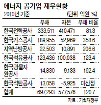 기획재정부가 지난 28일 발표한 ‘2010 회계연도 호날두 토토사이트 결산’ 내용을 분석한 결과 한국전력공사, 한국가스공사, 한국지역난방공사, 한국석유공사, 한국광물자원공사, 한국석탄공사 등 6개 에너지 공공기관의 평균 부채 비율은 120.7%로 2009년 106.7%에 비해 14.0%포인트 상승했다. 자본 규모는 그대로인데 빚만 대폭 늘었다.