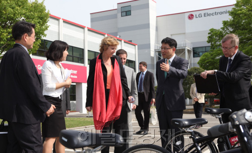►사진설명2=블랙토토전자 구미사업장을 방문한 헤더가드(가운데) EU 집행위원장이 사업장에서 쓰이고 있는 태양열 전기구동 자전거를 살펴보고 있다.