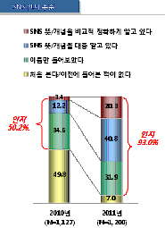 시장조사전문기관 트렌드모니터(trendmonitor.co.kr)가 만 13세~49세 이하 성인남녀 1200명을 대상으로 SNS에 관한 설문조사를 실시한 결과, SNS 인지율이 지난해 같은 조사결과(50.2%) 보다 2배 가까이 상승한 93%에 이르렀다.