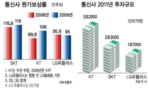 ▶원가보상률, 절대적 기준 아니다=6일 방통위에 따르면 SK텔레콤, KT, LG유플러스 등 이동통신 3사의 지난 2009년 원가보상률은 각각 118.6%, 108%, 95%로 나타났다. 이 같은 수치는 2세대(2G)와 3G를 합한 평균값으로 KT의 경우 유선 부문을 포함하면 원가보상률은 98.3%로 낮아진다. SK텔레콤의 원가보상률은 지난 2000년 이후 10년 이상 100%를 넘고 있지만 LG유플러스는 그 반대다.