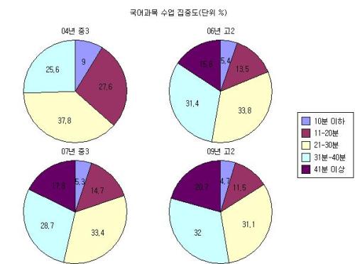 한국 교육개발원이 지난 2003년부터 전국의 초ㆍ중ㆍ고등bet365 토토사이트 학생들을 대상으로 조사한 ‘한국 교육 실태 및 조사분석 연구’보고서에 따르면 2007년 중bet365 토토사이트 3학년 학생의 20% 정도가 국어시간에 수업시간의 절반도 안되는 20분 이하만 집중력을 유지할 수 있다고 답했다. 수업시간 전부에 해당하는 41분이상 수업시간에 집중력을 발휘한다는 학생은 고작 17.8%에 불과했다. 고등bet365 토토사이트도 마찬가지여서 2009년 고등bet365 토토사이트 2학년생의 71.35%가 국어 수업시간 중 30분 이상 집중할 수 없다고 답했다. 결국 수업시간이 학원에 가기 전 ‘쉬는 시간’으로 탈바꿈 하고 있는 꼴이다.