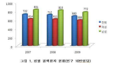 국민건강보험공단(이사장 정형근)이 건강보험 진료비 지급 자료를 이용해 입원 및 외래로 3회 이상 방문한 건강보험 사이다토토환자(A15~A19) 현황을 분석한 결과, 지난 2009년 기준으로 인구 10만명당 사이다토토으로 진료를 받은 여성은 588명이었고 남성은 이보다 31%나 많은 772명에 이르렀다.
