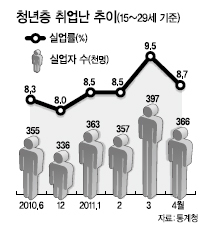 11일 통계청은 ‘고용동향’ 보고서에서 지난달 15~29세 청년층 실업률은 8.7%로 전년 동월 대비 0.1%포인트 증가했다고 밝혔다. 전체 실업률은 감소했지만 20, 30대는 예외였다.