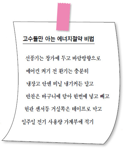 “꾸준히 전기 사용량 수치를 적어가다 보면 언제 얼마나 전기를 썼는지, 어떤 전자제품을 썼을 때 전기가 많이 나갔는지 자연스럽게 알 수 있습니다. 거기에 맞춰 불필요한데 전기를 지나치게 많이 쓰는 전자제품 사용을 줄여나가면 됩니다. 제 경험을 비춰볼 때 전기밥솥이나 모터가 돌아가는 청소기, TV 등의 전기 사용량이 많더군요.”