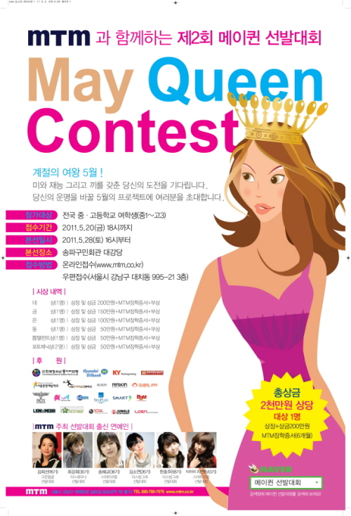 MTM은 과거 각종 선발대회를 주관하며 김희선, 김소연, 송혜교, 최강희, 김사랑, 한효주 그리고 최근의 ‘티아라’ 지연까지 수많은 스타들을 배출한 바 있으며, 작년에 열린 제1회 메이퀸 선발대회에서는 토토사이트 가입하면의 막내 멤버인 혜리가 선발된 바 있다.