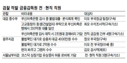 중수부 수사망에 걸려든 금감원 인사들은 6명이나 된다. 전날 구속된 이모 현직 팀장은 부산저축은행 검사에 나갔다가 불법대출 등을 눈감아주는 대가로 1억2000만원을 받은 것으로 전해졌다. 고교동창의 동생(부동산업자)에게서 대출 부탁을 받고 전화 한 통화로 부산저축은행에서 220억원 대출을 이끌어낸 최모 수석조사역도 최근 구속기소됐다.
