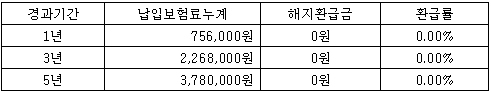 *5년 마다 갱신되는 상품으로 갱신 시 피보험자(보험대상자)의 보험나이와 보험료율에 따라 보험료가 인상될 수 있으며, 만기환급금이 없는 순수보장형 상품임