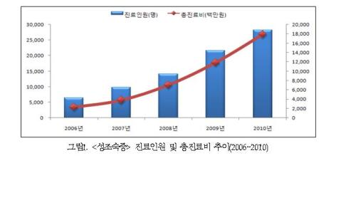 성별로는 2010년 기준 여아의 진료인원이 남아보다 12.3배 많은 것으로 나타났으며, 점유율은 92.5%였다.