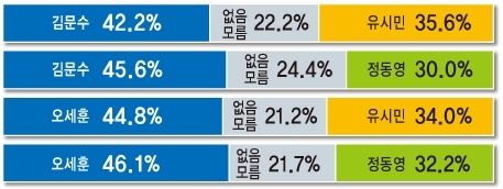 여권 내 차기 주자로 꼽히는 오세훈 서울시장과 김문수 경기지사의 지지율은 토토사이트 토사장하락했다. 올 1월 조사에서 오 시장과 김 지사의 지지율은 각각 8.4%, 8.1%. 그러나 4개월 만에 두 사람 모두 6.6%를 나타냈다.
