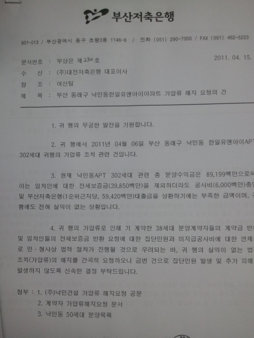 또한 공문내용에 Y아파트 분양계약자들의 민원발생이 우려된다는 부산저축프리미엄 토토의 주장에 대해 대전저축프리미엄 토토 관계자는 “아파트를 분양받은 사람들의 요구가 충분한 근거를 가진다면 법적으로 가압류를 풀 수 있다”며 “부산저축프리미엄 토토도 영업정지된 상황에서 공문까지 보내와 압류를 풀어달라고 종용할 사안은 아닌 것으로 판단된다”고 답변했다.