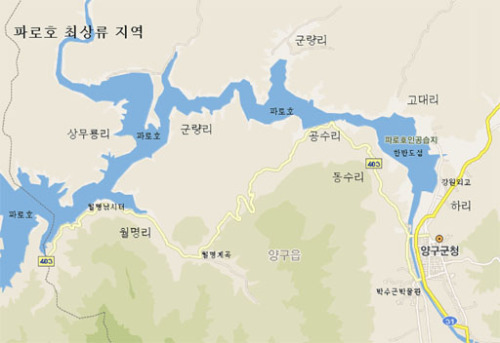 양구읍 콜로세움 토토벨트를 좀 더 넓혀 보면 군량리와 상무룡리, 월명리까지 확장된다. 양구읍 중심지에서 조금 멀긴 하지만 파로호의 호젓한 풍광을 즐기기에는 되레 안성맞춤이다. 땅 값도 훨씬 저렴하다. 군량리의 경우 2차선도로에 접한 관리지역 땅이 10만원선, 농로길 옆 땅은 5만~6만원선이다. 마을 주민에 따르면 군량리와 접한 상무룡리에는 고 이승만 대통령의 별장이 있다고 한다.