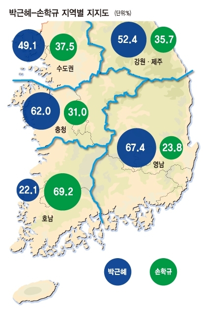 이는 유권자들이 박 전 대표 대항마는 손 대표라는 의사표시를 분명히 한 것으로 풀이된다. 실제 박-손 양자대결 성사 가능성을 높이고 있다는 방증이다.
