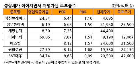 헤럴드경제가 16일 증권사 3곳 이상 올해 실적 전망치가 있는 16개 자동차토토사이트 번호 차단 관련주의 실적과 밸류에이션을 분석한 결과, 상신브레이크 성우하이텍 세방전지 디아이씨 에스엘 평화정공 S&T대우 등 7개 종목이 PER 6~8배 수준에 이익 성장을 골고루 갖춘 것으로 나타났다.