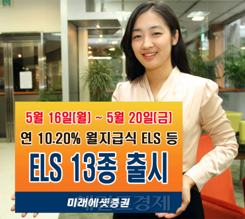 미래에셋증권(부회장 최현만)은 원금보장 및 원금비보장형 파생결합증권 ELS 13종을 오는 20일까지 총 930억 규모로 판매한다고 16일 밝혔다.