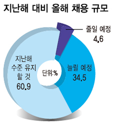 올해 초 국내 주요 실시간 해와 토토사이트이 상반기에 20여만명을 뽑는 등 고용을 확대하겠다고 했지만 본지와 대한상의의 설문조사 결과, 전반적인 채용 규모는 지난해와 비슷할 것으로 전망됐다. 투자 규모 역시 지난해 수준을 유지하겠다는 답변이 압도적이었다. 설문조사에 참여한 1012개 기업 중 616개 기업(60.9%)은 올해 채용 규모에 대해 지난해 수준을 유지할 것이라고 답했다. 지난해보다 많은 인력을 채용하겠다는 기업은 349개로 전체의 34.5%에 그쳤다. 반면 지난해보다 채용을 줄일 것이라고 답한 기업은 47곳으로 4.6%를 차지했다.