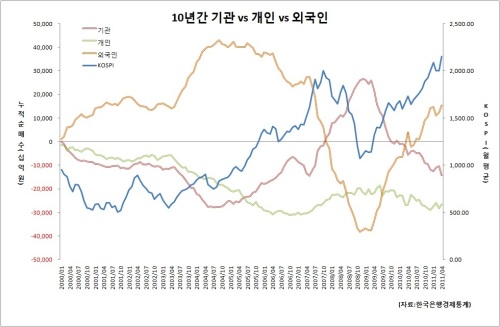 국내 토토사이트 케이벳은 최근 10년간 외국인이 주도해왔고, 지금도 그렇다. 외국인과 국내자금은 엇갈린 행보를 보여왔다. 여러 분석이 가능하지만, 확실한 것은 외국인이 비중을 줄일 때는 금리상승기, 달러강세기였다.