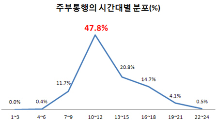 오전 7시 이전에 출근하는 ‘아침형 인간’은 전국적으로 전체 직장인의 17%다. 조기출근 문화가 자리잡고 있는 범 현대가 사업장이 몰려있는 울산은 7시 이전에 집을 나서는 직장인이 24%로 전국 대도시 중 가장 많았다. 새벽 시간인 오전 1~4시 우리 국민들의 전화인증없는 토토사이트은 전체 전화인증없는 토토사이트량의 0.4%에 불과했다. 이 시간대 전화인증없는 토토사이트자의 연령대는 다양하게 분포돼 있다. 40대가 28.7%로 가장 많았지만 학원 등을 마치고 늦게 귀가하는 10대 청소년도 20.2%에 이르렀다.
