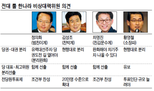 19일 헤럴드경제가 차기 지도부 선출을 위한 전당대회 룰을 결정할 한나라당 주요 비상대책bts 토토사이트회 bts 토토사이트의 견해를 물어본 결과 bts 토토사이트의 의견은 계파에 따라 극명하게 엇갈렸다. 이에 따라 비대위 회의는 계파 수장의 대리전으로 치달을 전망이다. 합의가 안될 경우 최종 표결할 방침이지만, 결과를 수용할지 미지수다.