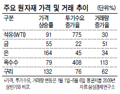 보고서는 미국 상품선물위원회(CFTC)의 비상업거래 순매수 포지션으로 추정한 상반기 투기수요 증가율이 석유(서부텍사스유 기준)는 775%, 옥수수는 408%, 은은 45%, 금은 22%에 달하는 것으로 보고 있다.