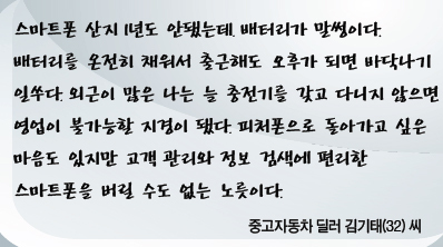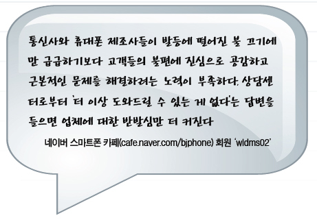 또 통신사나 제조사에 문제를 제기하지 않으면, 불편을 겪어도 정당한 보상을 해주지 않는다는 불신이 크다. 같은 통신 장애를 경험했더라도 어떤 방식으로 불편을 호소하느냐, 누가 응대하느냐에 따라 “6개월 동안 무료통화 60분” “통신비 50% 할인” 등 각기 다른 보상안이 나오기 때문이다. 게다가 약정으로 묶여있는 경우, 단말기 값과 위약금을 지불하지 않는 이상 통신사를 옮길 수 없기 때문에 불편이 반복돼도 참을 수밖에 없다.
