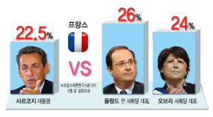 블룸버그통신은 프랑스여론연구소(IFOP)가 지난 5월 말 2000여명의 프랑스 국민을 상대로 실시한 차기 대통령 여론조사 결과를 인용, 올랑드 전 대표와 오브리 대표는 각각 26%, 24%의 득표율을 보일 것으로 예상된 반면 사르코지 대통령은 22.5%의 득표율에 그칠 것으로 전망했다.