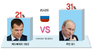 러시아 구도는 드미트리 메드베데프가 2008년 43세의 젊은 나이에 러시아 대통령이 된 것은 온전히 블라디미르 푸틴 당시 대통령(현 총리) 덕분이다. 푸틴 대통령이 3선 연임 금지로 일단 메드베데프를 앞세우고 2012년에 다시 권좌에 복귀할 것이란 전망에 이의를 제기하는 사람은 없었다. ‘실세총리’와 ‘얼굴 마담’의 동거는 별 무리 없이 순항했다. 그러나 내년 3월 대선을 앞두고 양측의 긴장이 고조되고 있다.