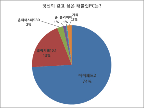 20일 스마트폰 정보 포털 ‘앱스토리(www.appstory.co.kr)’에 따르면 지난 6일 부터 19일까지 스마트폰 이용자 2582명을 대상으로 ‘당신이 갖고 싶은 태블릿 PC는?’에 대한 설문조사를 한 결과, 애플 ‘아이파주 토토사이트2’가 74%의 압도적인 지지율로 1위를 차지했다. 사용할 수 있는 애플리케이션 숫자가 많다는 점이 주목을 받았고 운영체제간 앱 호환 불가능 부분은 가장 큰 걸림돌로 지적됐다.