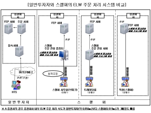 검찰은 이들이 이런 수법을 이용해 일반투자자보다 약 3~8배 빨리 주문을 처리할 수 있었다고 밝혔다. 이 때문에 ELW시장에 개설된 스캘퍼의 계좌는 전체의 0.16%에 불과하지만 ELW전체 거래 대금의 75%이상을 차지하는 실정이다.