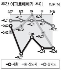 24일 부동산정보업체 닥터아파트가 6월 17일부터 23일까지 경기와 신도시 매매가변동률은 각각 -0.02% (↓0.01%p), -0.06%(↓0.03%p)를 기록했다.