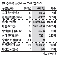 우리 경제가 50년 동안 눈부시게 발전한 만큼 한전도 성장했다. 61년 12억㎾h에 불과했던 판매 전력량은 2010년 4342억㎾h로 무려 365배 증가했다. 총자산과 매출은 50년 새 9666배, 1만5803배로 숫자를 가지고 따지기 어려울 만큼 불어났다. 50년 전 4만㎞에 그쳤던 배전선로 총연장은 이제 33배 늘어난 120만㎞에 달한다.