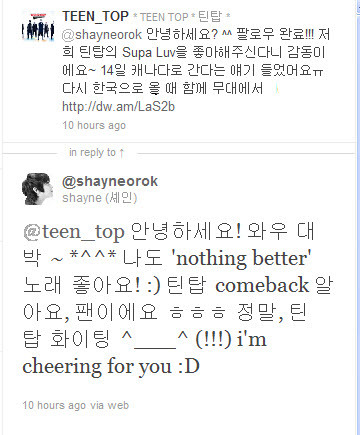 이에 TEEN TO(원탑토토)은 트위터를 팔로우한 셰인에게 “안녕하세요? ^^ 팔로우 완료!!! 저희 원탑토토의 Supa Luv을 좋아해주신다니 감동이에요 14일 캐나다로 간다는 얘기 들었어요ㅠ 다시 한국으로 올 때 함께 무대에서 Nothing better 부르고 싶어요ㅋ 저도 Nothing better 좋아하거든요~저희도 멋진 모습으로 컴백할 테니 지켜봐주세요!! 형!!(다음에 만날 땐 좀 더 친근하게 형~이라고 부를 수 있도록 친해져요. 옆에서 캡형은 친구래요^^)”라며 감사인사를 전했다.