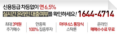 - 연 6.5%금리, 최대 3억원 추가매수 - 관심종목 한종목 100% 집중투자 - 대출과 상환이 자유로운 마이너스통장식 - 동일계좌로 한도를 높여 추가대출도 가능 - 미수상환/미수동결계좌로 실시간 온라인 입금