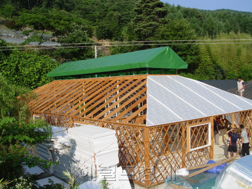 이 회사의 토토사이트 하피 캐나다산 홍송원목 격자들이 건물의 기둥이자 벽체와 마감재 역할을 한다. 천막은 천연섬유 재질로 환경오염이 없으며, 내피와 외피 사이에 삽입되는 단열재를 포함해 벽 두께가 60㎜에 달해 단열효과가 뛰어나고 외풍이 없다.
