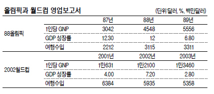 지난해 국내총생산(1172조원)의 2%에 달한다. 하지만 88올림픽과 2002월드컵의 경우 행사가 열리는 해까지 잘 나가다 그 다음해 큰 폭으로 하락하는 모습을 보였다는 점을 기억해야 한다. 앞의 실적이 너무 좋아 생기는 기저효과를 감안해도 사후관리가 더 중요하다는 점을 시사한다.
