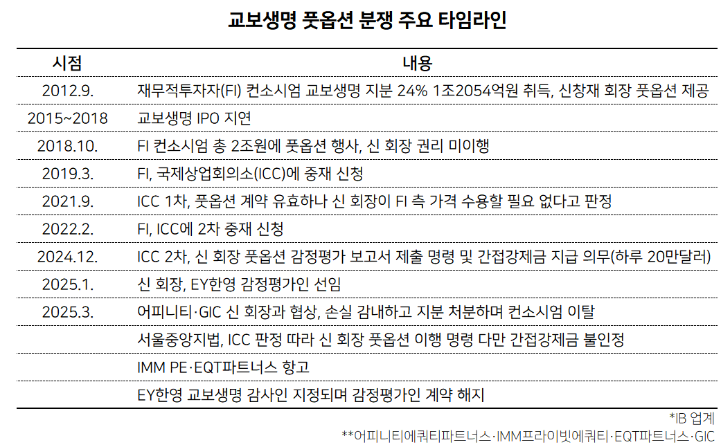 이제 FI는 또 다시 신 페가수스 토토과 시간 싸움을 벌이게 됐다. 앞서 FI 컨소시엄은 2012년 대우인터내셔널이 소유하던 교보생명 지분을 1조2054억원에 인수했다. 당시 신 페가수스 토토과 주주 간 계약을 통해 교보생명의 상장 시한을 정하고 추후 지분을 되팔 수 있는 풋옵션을 제공 받았다. 교보생명 상장은 기존 보장됐던 2015년에서 2018년까지 지연됐고 그해 10월 FI 컨소시엄은 총 2조원 규모로 풋옵션을 행사했다.