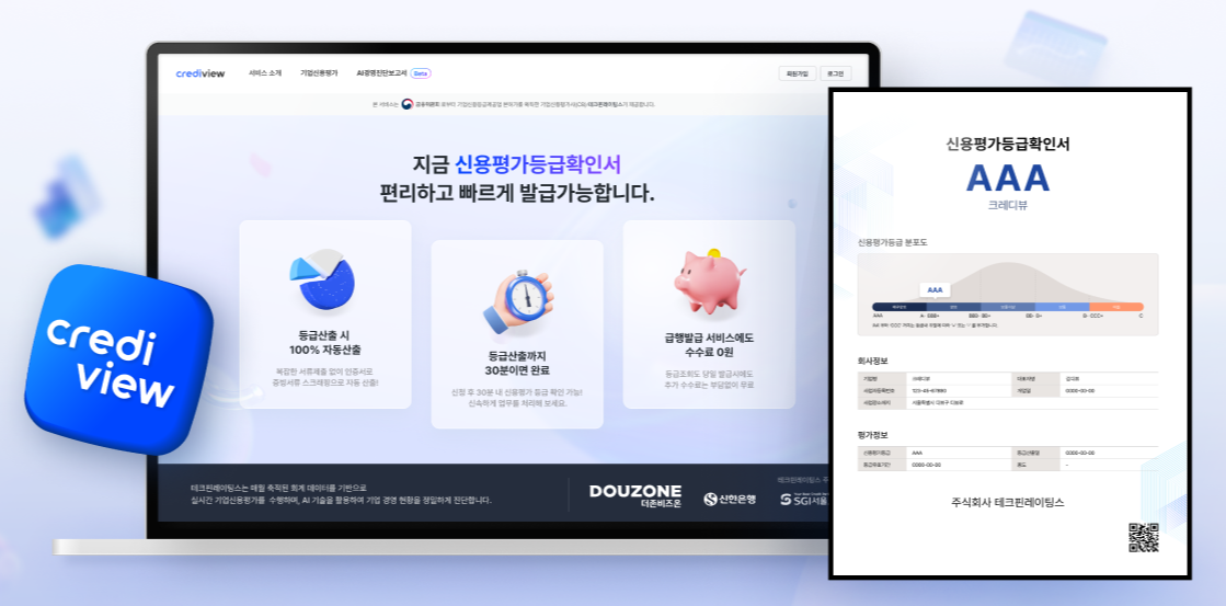 더존비즈온의 핀테크 전문 계열사 테크핀레이팅스는 인공지능(AI) 기반 기업신용평가플랫폼 ‘크레디뷰’(Crediview·사진)를 출시, 업계 최초로 라오스 스포츠토토 무료 조회 서비스 제공에 나선다고 8일 밝혔다.