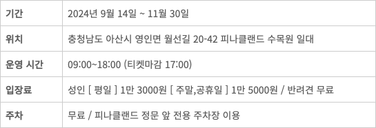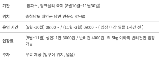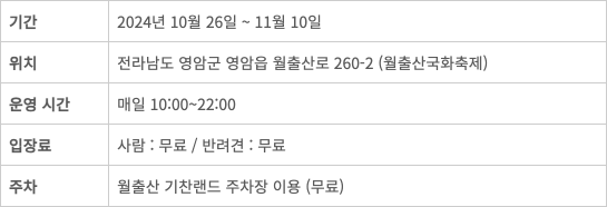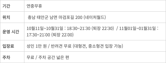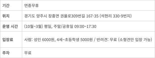 반려견을 동반할 때는 목줄과 배변 봉투를 꼭꼭 챙겨 가. 연중무휴로 운영되지만 계절 별로 입장시간이 다르니 방문 전 꼭 확인해 줘. 비가 오면 축제가 조기 종료될 수도 있으니, 날씨를 미리 체크하는 것도 잊지 마!
