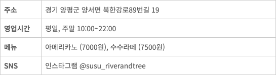꽃구경까지 마쳤으면 맛있는 디저트와 차도 마셔야 되잖아? ☕️ 북한강변에 위치한 수수카페는 카림토토 함께 강바람을 쐬기에 안성맞춤이야. 유유히 흐르는 북한강 맞은편에는 단풍으로 불타오르는 산등성이가 바라다보이고 그 옆으론 기차가 기적소리를 울리며 지나가는 그림 같은 풍경이 펼쳐져. 야외석 어디든 카림토토 함께 할 수 있어 ☺️