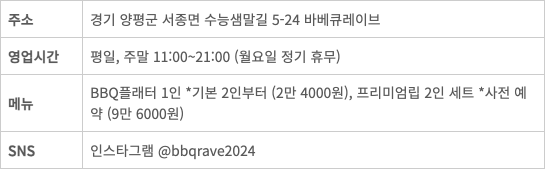 북한강 변엔 카림토토들과 함께 식사할 수 있는 식당이 몇 군데 있지만 오늘 소개할 곳은 카림토토들에게 너무 소중해. 반려견 유치원 뺨치게 넓은 잔디밭과 가을 냄새 물씬 풍기는 경치가 멋진 바베큐레이브야. 사장님이 밤새 직접 훈연하신 바베큐가 미국 텍사스 뺨치더라고 ✨