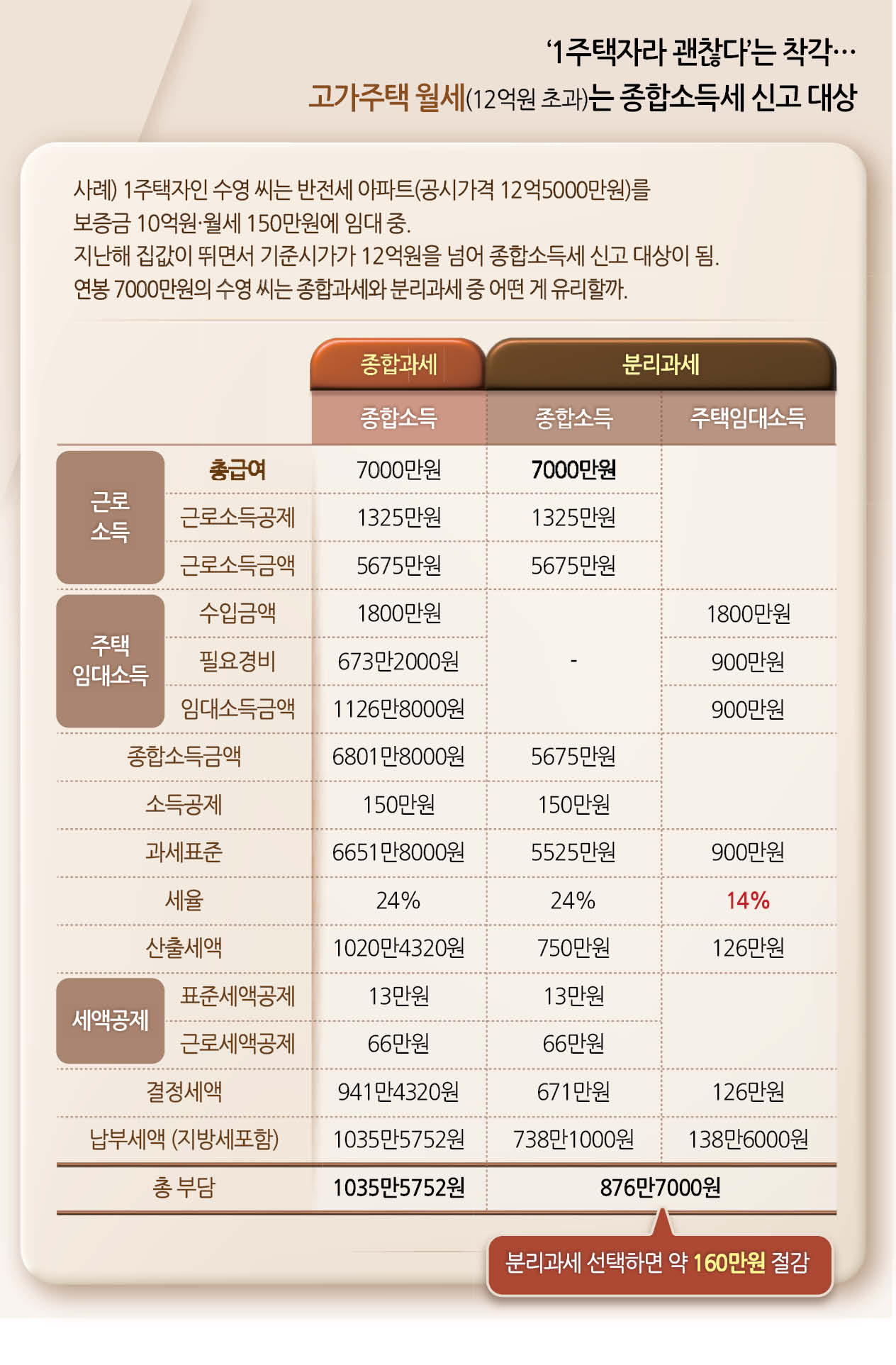 결론적으로 근로소득과 온라인 토토사이트 신고임대소득에 총 세금을 비교해보면, 종합과세 시 낼 세금은 약 1035만원, 분리과세를 선택하면 약 876만원이 나옵니다. 분리과세가 약 160만 원 정도 더 유리하다는 결론이 나와요.