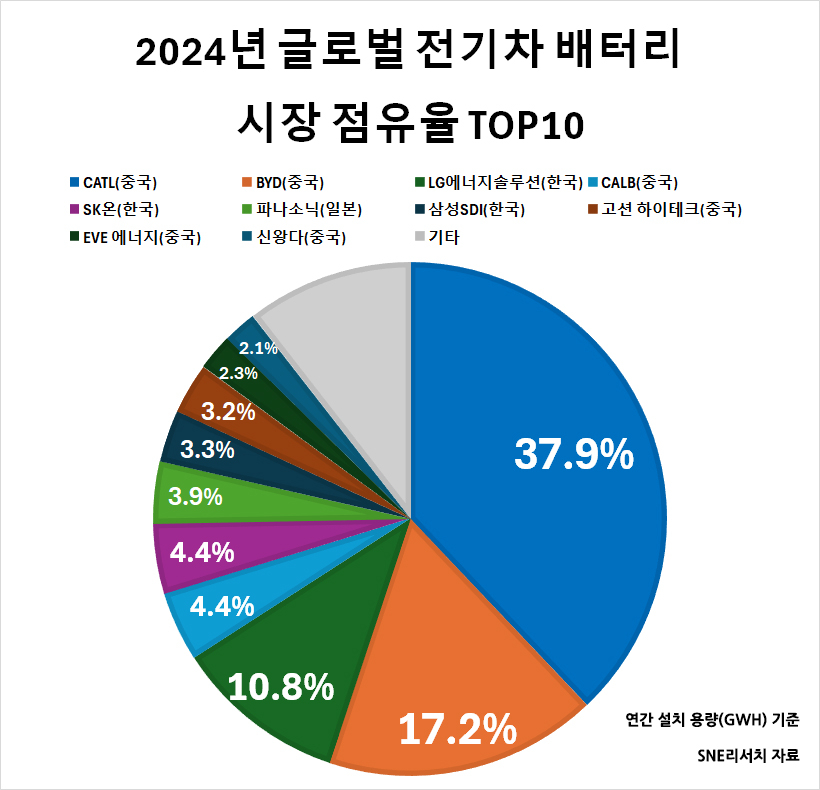 한국 배터리 3사의 경우 LG에너지솔루션(10.8%)을 비롯해 5위 SK온(4.4%), 7위 삼성SDI(3.3%) 등을 모두 합할 경우 점유율이 18.5%에 그쳤습니다.
